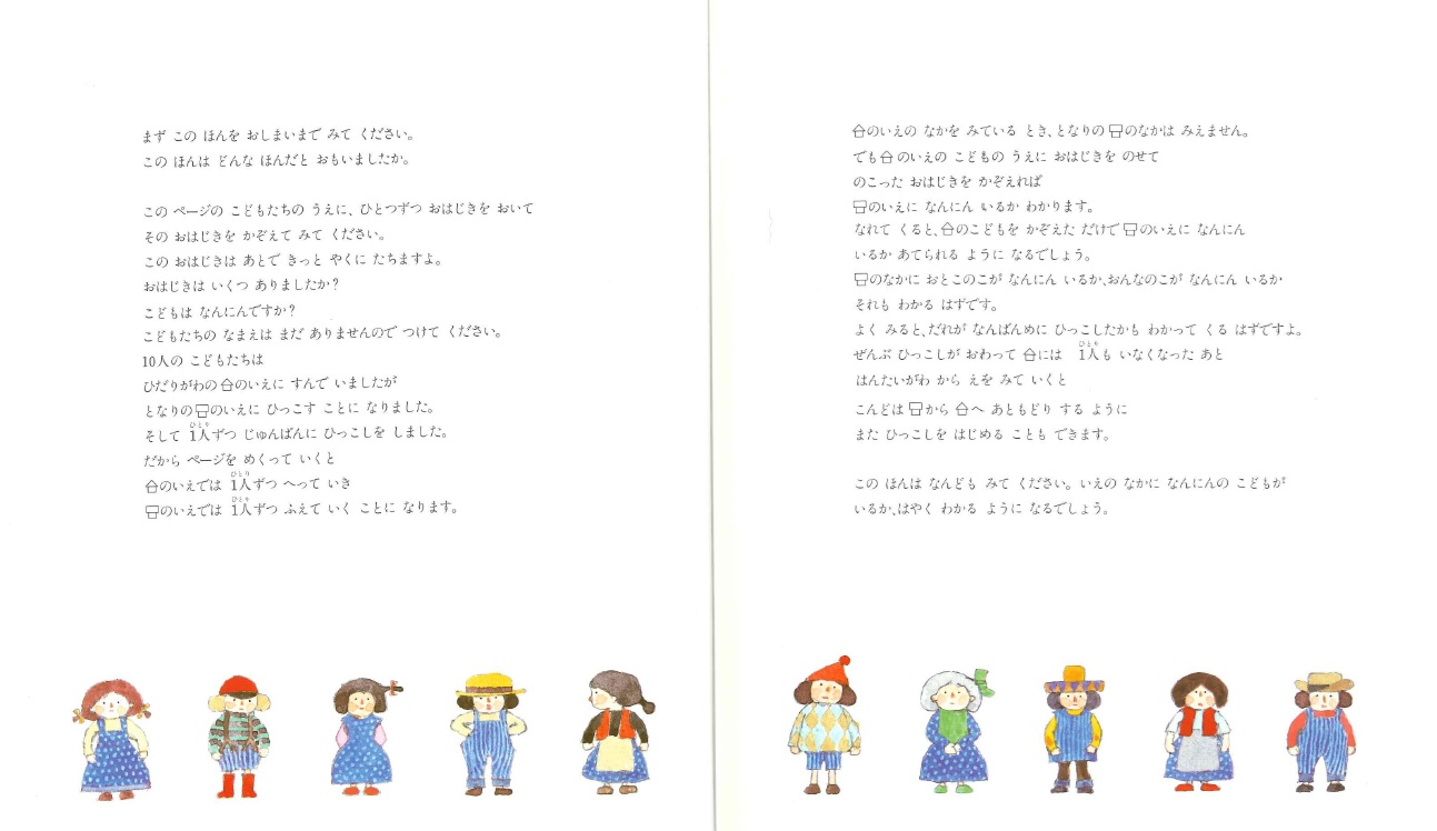 絵本を開くと、左ページに家があって、こどもが10人います。