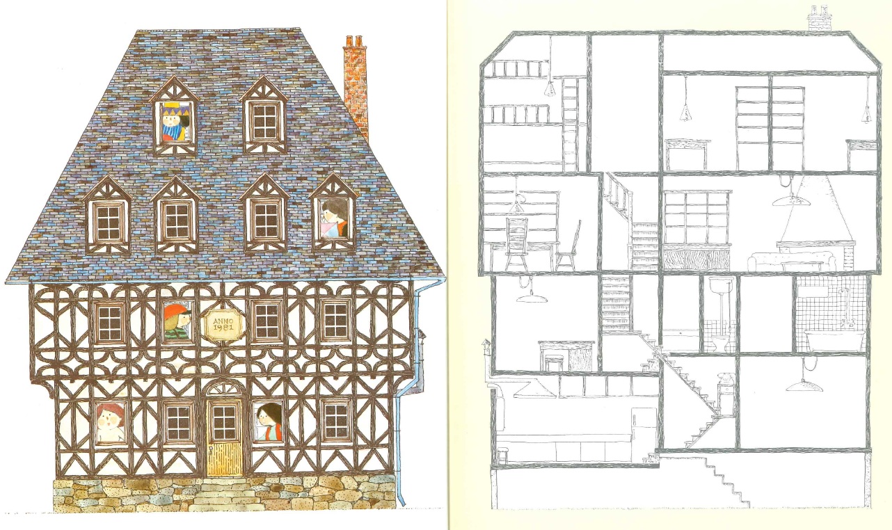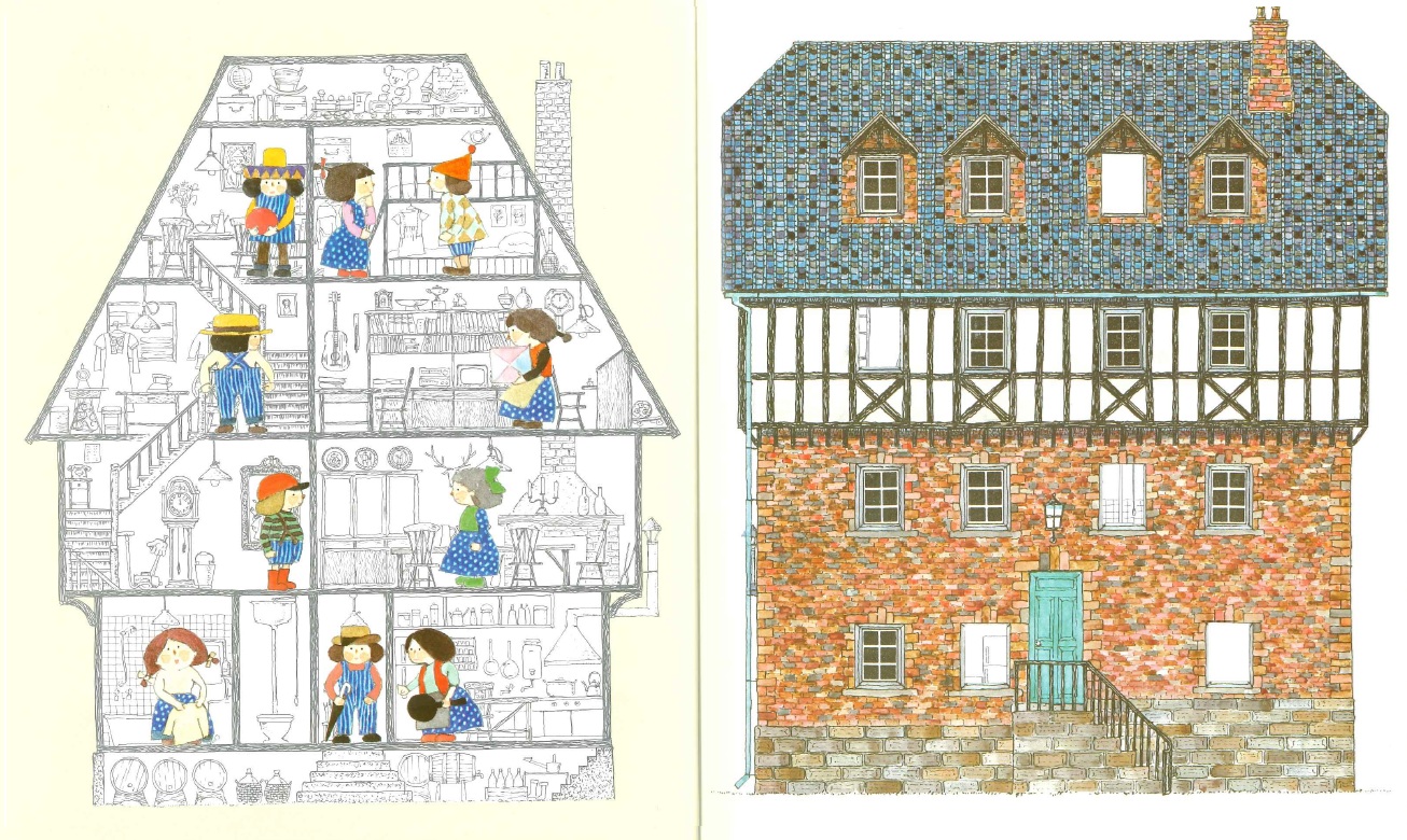 右ページには別の家の外面があって、こどもたちは左の家から右の家にひっこしていきます。